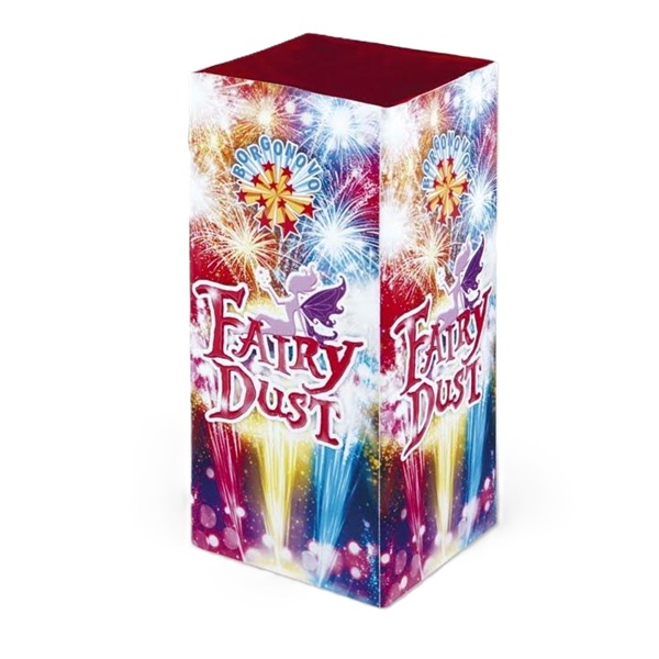 Batteria di 4 fontane assortite rosso, blu e giallo con crisantemi argento e cracker.